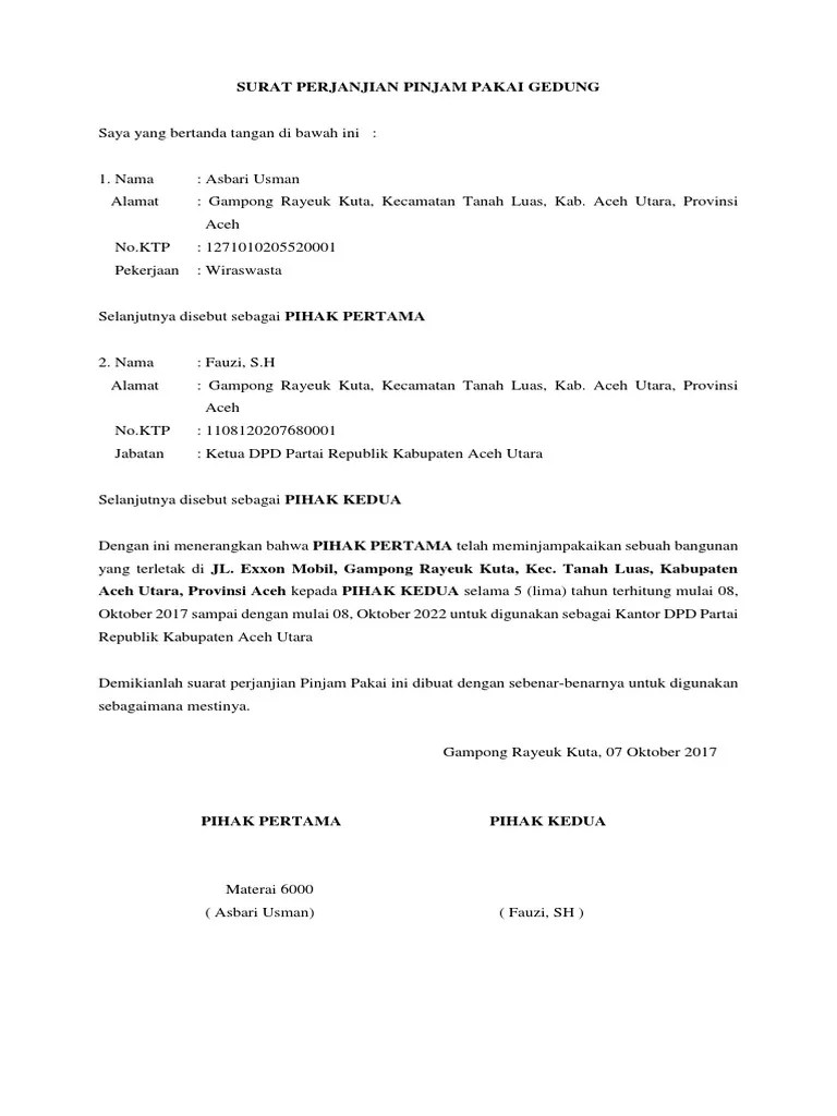 Demikian perjanjian ini dibuat dan ditandatangani oleh para pihak dalam . Surat perjanjian pinjam pakai rumah dinas.docx · surat perjanjian pinjam pakai . Menyimpan dan memelihara barang yang dipinjamnya sebagai seorang bapak rumah yang baik ( pasal 1744 kuhperdata ). Surat permohonan sekretaris utama badan kepegawaian negara nomor: Detiklife com contoh surat perjanjian pinjam pakai yang sah dan.
