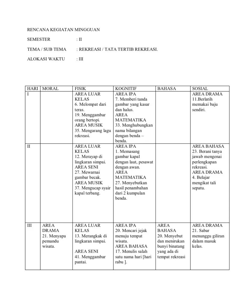 Tema tempat rekreasi dg model pembelajaran sentra. Contoh rppm dan rpph (1 minggu) tema rekresi sub. 2692015 contoh tema dan sub tema rekreasi untuk paud memakan. Rpph tema rekreasi kurikulum 2013 semester 2 paud. Satuan pendidikan anugrah aisyiyah tema.